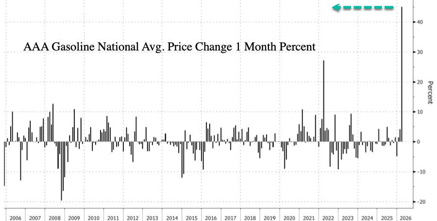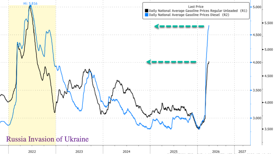 Furthermore, AAA data shows the national average diesel price has surged 45% this month to $5.45 per gallon. That marks the largest spike on record.