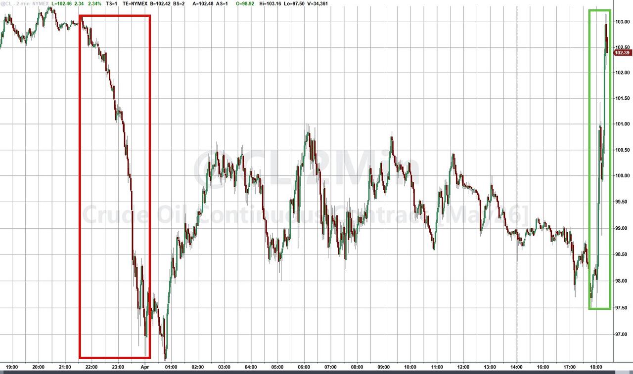 Oil had been selling off heading into Trump's address, with traders looking for clearer signals on whether Washington will end the war in the coming weeks, but started to rally strongly as Trump began speaking as traders did not hear the 'mission accomplished' they were hoping for, erasing all of yesterday's ceasefire chatter...